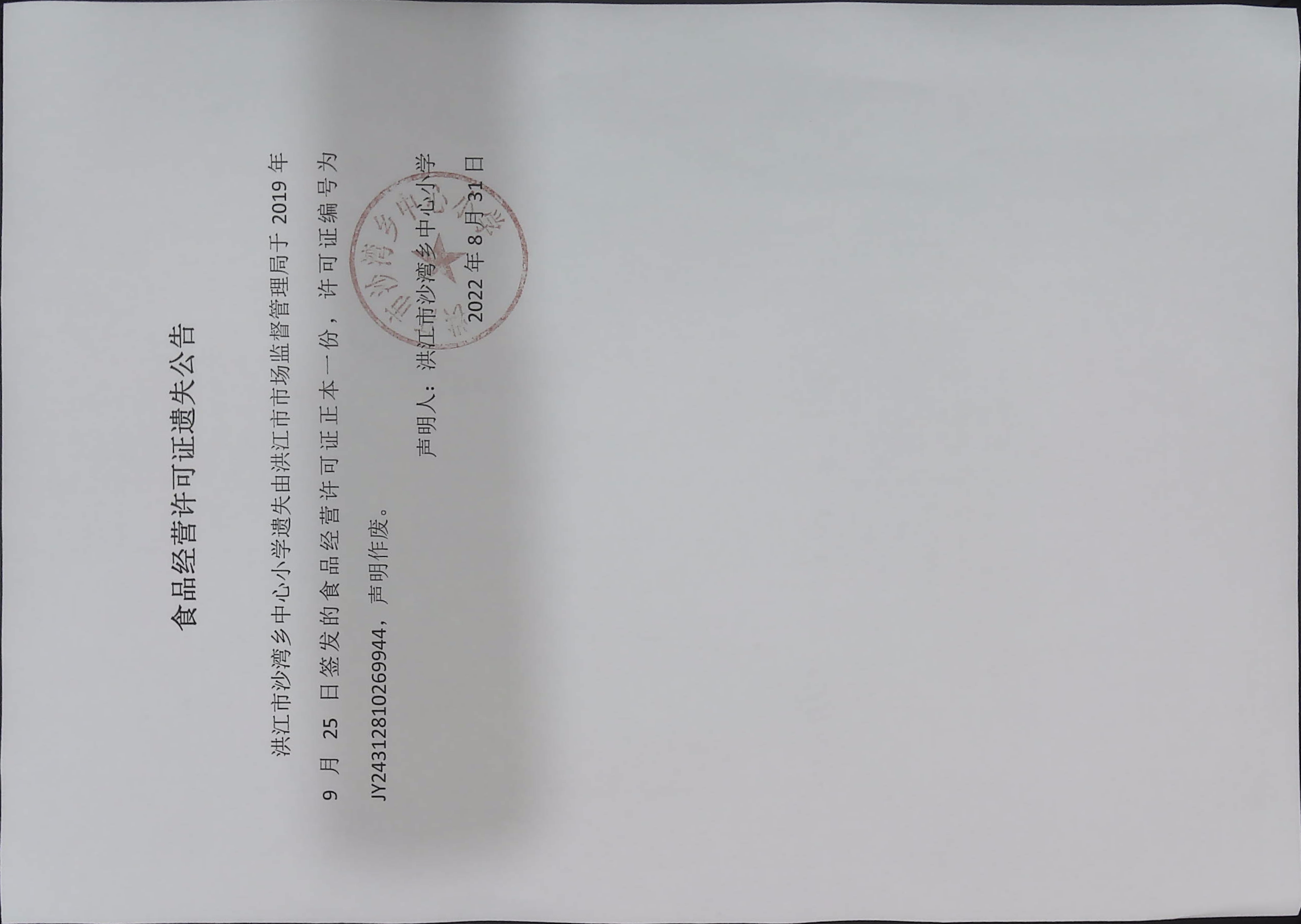 bt365账户为什么封_日博365官网网址多少_365bet网上娱乐沙湾乡中心小学遗失由bt365账户为什么封_日博365官网网址多少_365bet网上娱乐市场监督管理局于2019年9月25日签发的食品经营许可证正本一份,许可证编号为:JY24312810269944,声明作废。